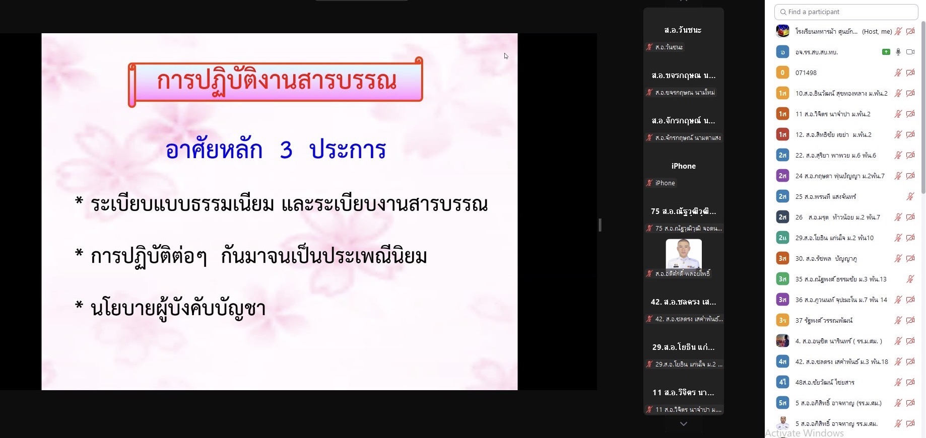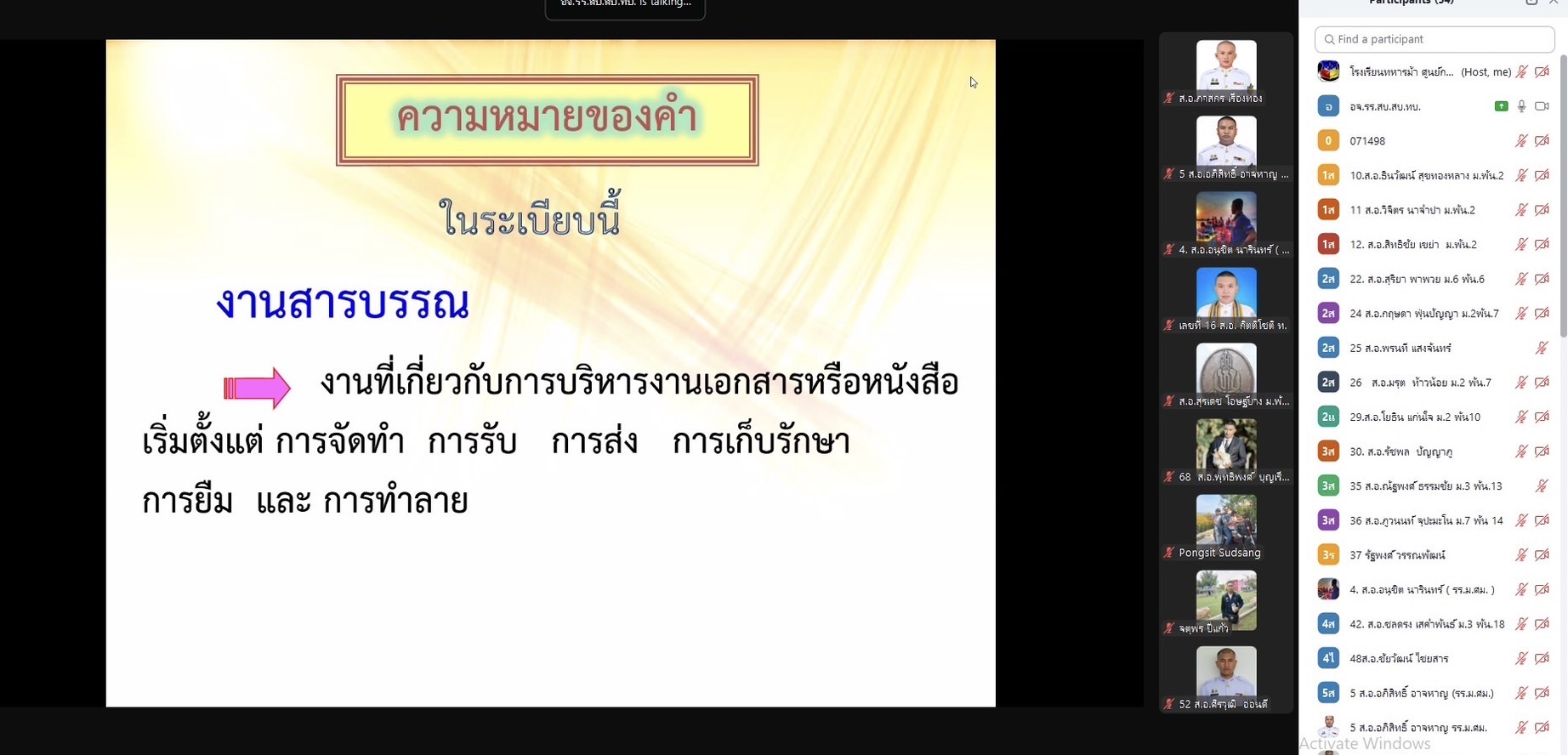 เมื่อวันที่ 23 มิ.ย. 68 แผนกวิชาทั่วไป กศ.รร.ม.ศม. ดำเนินการฝึกอบรม วิชาระเบียบงานสารบรรณ และ วิชาภาษาอังกฤษ ผ่านระบบ ZOOM Cloud Meeting ให้กับ นสน. หลักสูตรนายสิบชั้นต้น รุ่นที่ 3 เหล่า ม. ปี 68 (ห้วงฝึกอบรมผ่านสื่ออิเล็กทรอนิกส์ ณ ที่ตั้งหน่วย)