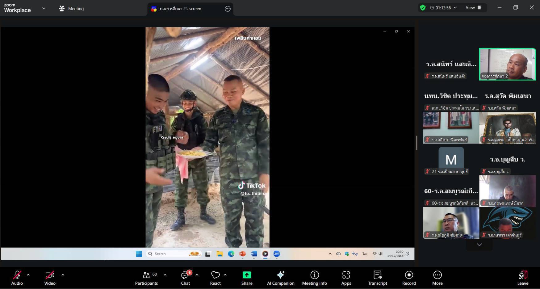 เมื่อวันที่ 14 ต.ค. 68 เวลา 1000-1200 แผนกวิชาทั่วไป กศ.รร.ม.ศม. ดำเนินการฝึกอบรม วิชาผู้นำหน่วย ผ่านระบบ Zoom Cloud Meeting ให้กับ นทน.หลักสูตรชั้นนายพัน เหล่า ม. ปี 69 (ห้วงฝึกอบรมด้วยตนเอง ณ ที่ตั้งหน่วย)