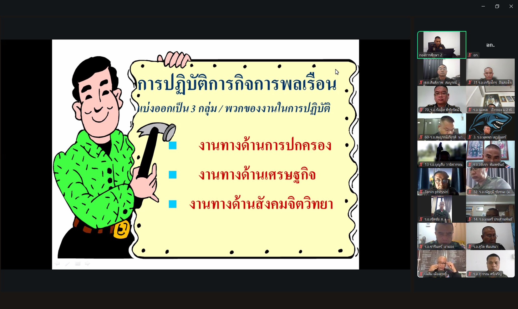 เมื่อวันที่ 24 ต.ค. 68 เวลา 0800 - 1500 แผนกวิชาฝ่ายอำนวยการ กศ.รร.ม.ศม. โดย ร.อ. กล้าประจญ สาคำภีร์ ตำแหน่ง อจ.แผนกวิชาฝ่ายอำนวยการฯ. และ พ.ท. ยุทธพงษ์ ขวัญม่วง ตำแหน่ง ผบ.พัน.นร.กรม นร.รร.ม.ศม. ดำเนินการฝึกอบรม วิชา การกำลังพล, MDMP สธ.1 และ วิชา กิจการพลเรือน, MDMP สธ.5 ให้กับ นทน. หลักสูตรชั้นนายพัน เหล่า ม. ปี 69 ผ่านระบบ Zoom Cloud Meeting (ห้วงฝึกอบรมด้วยตนเอง ณ ที่ตั้งหน่วย)