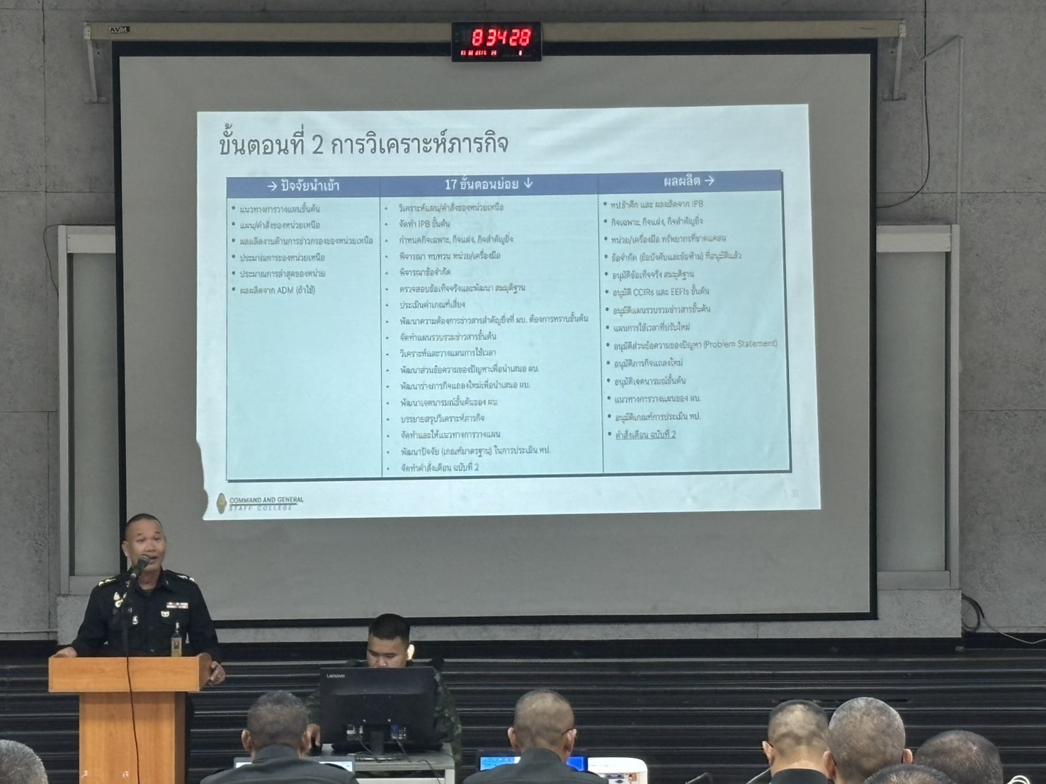 วันที่ 11 ธ.ค. 68 เวลา 0800 - 1700 แผนกวิชาฝ่ายอำนวยการ กศ.รร.ม.ศม. รับผิดชอบการฝึกอบรม หลักสูตรชั้นนายพัน เหล่า ม. ปี 69 ดำเนินการฝึกอบรม วิชาการแสวงข้อตกลงใจ ฝอ.4 อาจารย์ผู้สอน พ.ท.จาตุรงค์ แก้วสุวรรณ ตำแหน่ง อจ.แผนกวิชาฝ่ายอำนวยการ กศ.รร.ม.ศม. ณ ห้องเรียน 150 ที่นั่ง