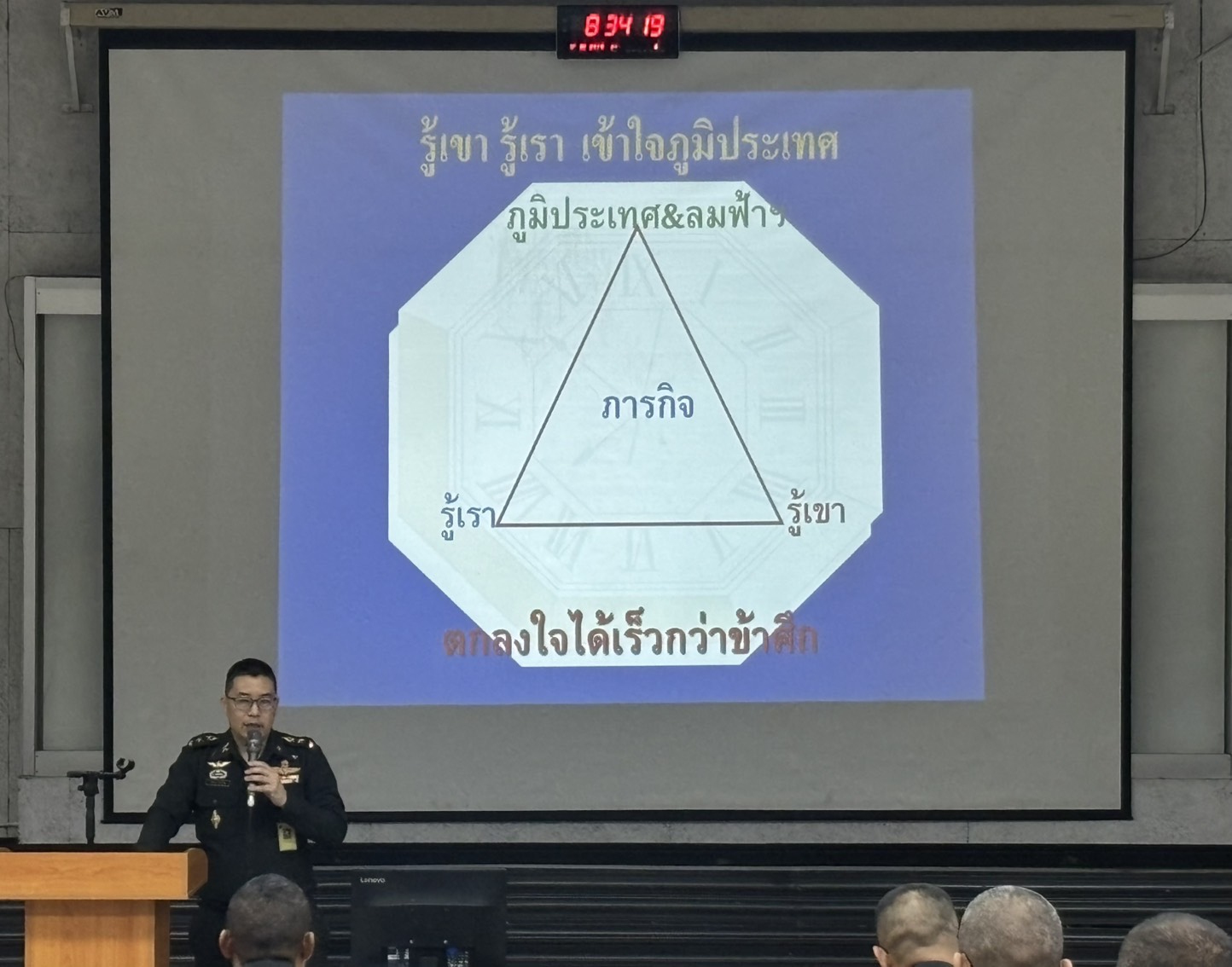 วันที่ 12 ธ.ค. 68 เวลา 0800 - 1700 แผนกวิชาฝ่ายอำนวยการ กศ.รร.ม.ศม. รับผิดชอบการฝึกอบรม หลักสูตรชั้นนายพัน เหล่า ม. ปี 69 ดำเนินการฝึกอบรม วิชาการวิเคราะห์พื้นที่ปฏิบัติการ (IPB) และ MDMP ในส่วน ฝอ. 2 อาจารย์ผู้สอน พ.อ.ชุมดวง เทพวัลย์ ตำแหน่ง นปก.ประจำ ศม. รรก.อจ.หน.วิชาฝ่ายอำนวยการ กศ.รร.ม.ศม. ณ ห้องเรียน 150 ที่นั่ง