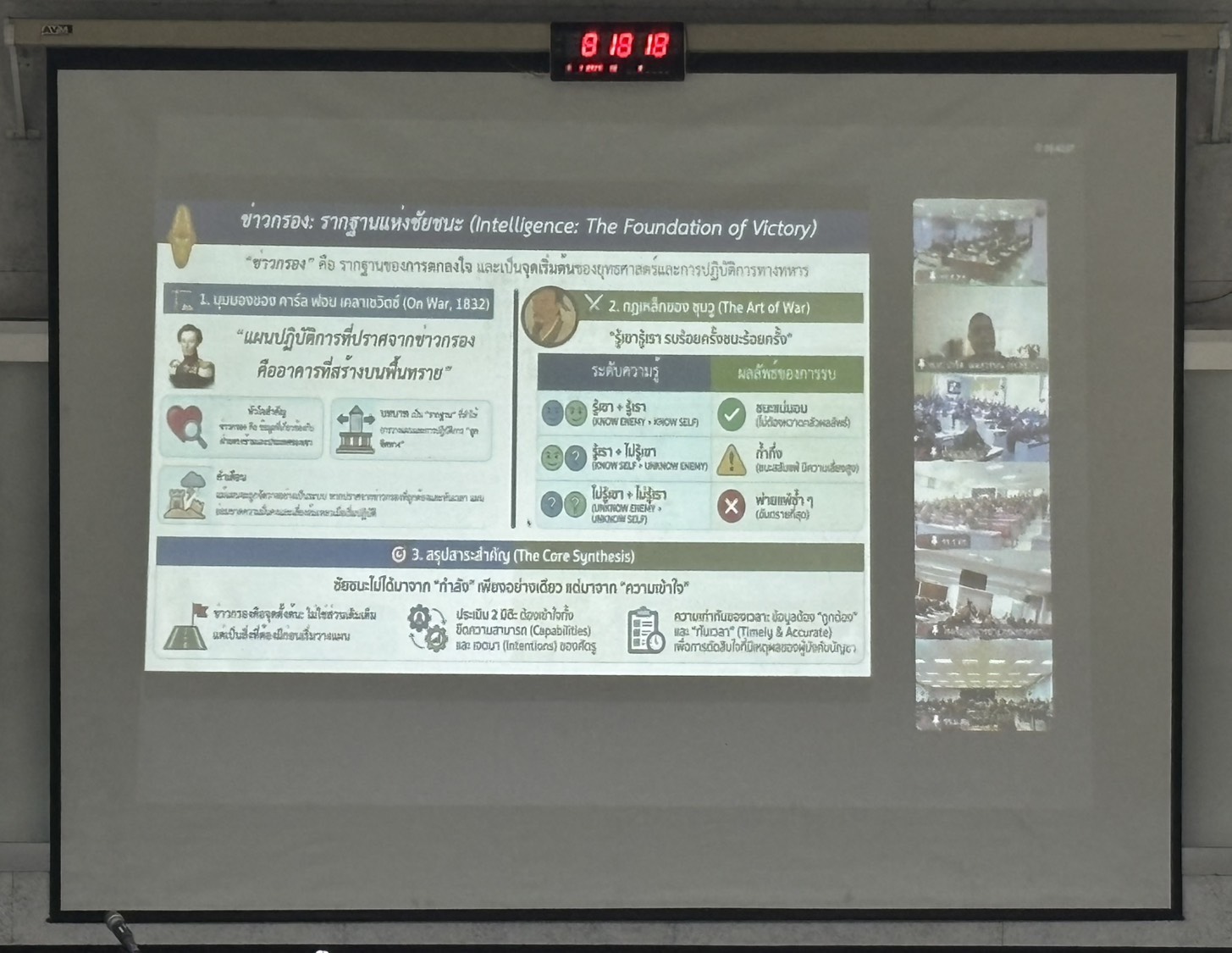 วันที่ 6 ม.ค. 69 เวลา 0800 - 1700 แผนกวิชาฝ่ายอำนวยการ กศ.รร.ม.ศม. รับผิดชอบการฝึกอบรม วิชา การจัดเตรียมสนามรบด้านการข่าว (IPB) อาจารย์ผู้สอน พ.ท.ปวริศ เมฆสุวรรณ ตำแหน่ง อจ.รร.สธ.ทบ. หลักสูตรชั้นนายพัน เหล่า ม. ปี 69 ณ อาคารเรียนรวม 150 ที่นั่ง