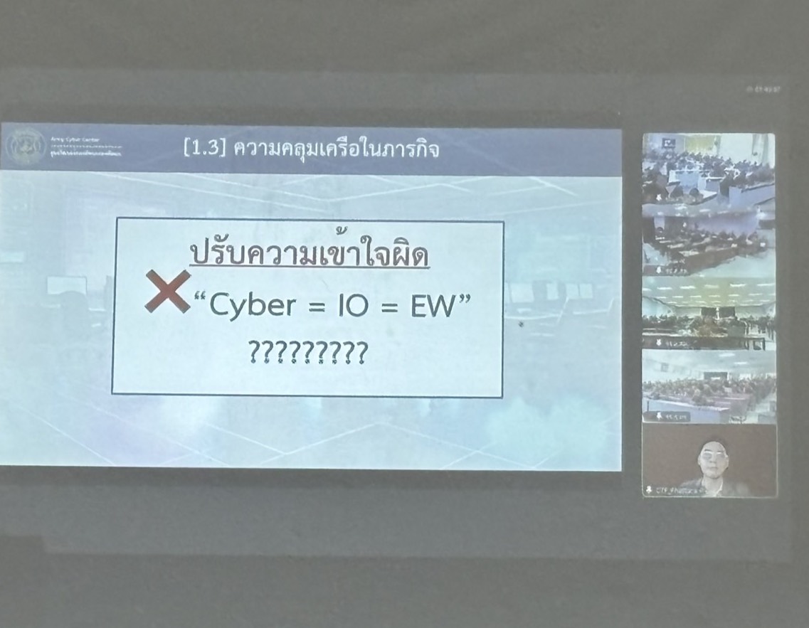 วันที่ 9 ม.ค. 69 เวลา 0800 - 1700 แผนกวิชาฝ่ายอำนวยการ กศ.รร.ม.ศม. รับผิดชอบการฝึกอบรม วิชาการบรรยายพิเศษ หัวข้อ สงครามไซเบอร์ในสนามรบ, การแสวงข้อตกลงใจทางทหาร หลักสูตรชั้นนายพัน เหล่า ม. ปี 69 อาจารย์ผู้สอน วิทยากรพิเศษ, อจ.รร.สธ.ทบ. ณ อาคารเรียน 150 ที่นั่ง