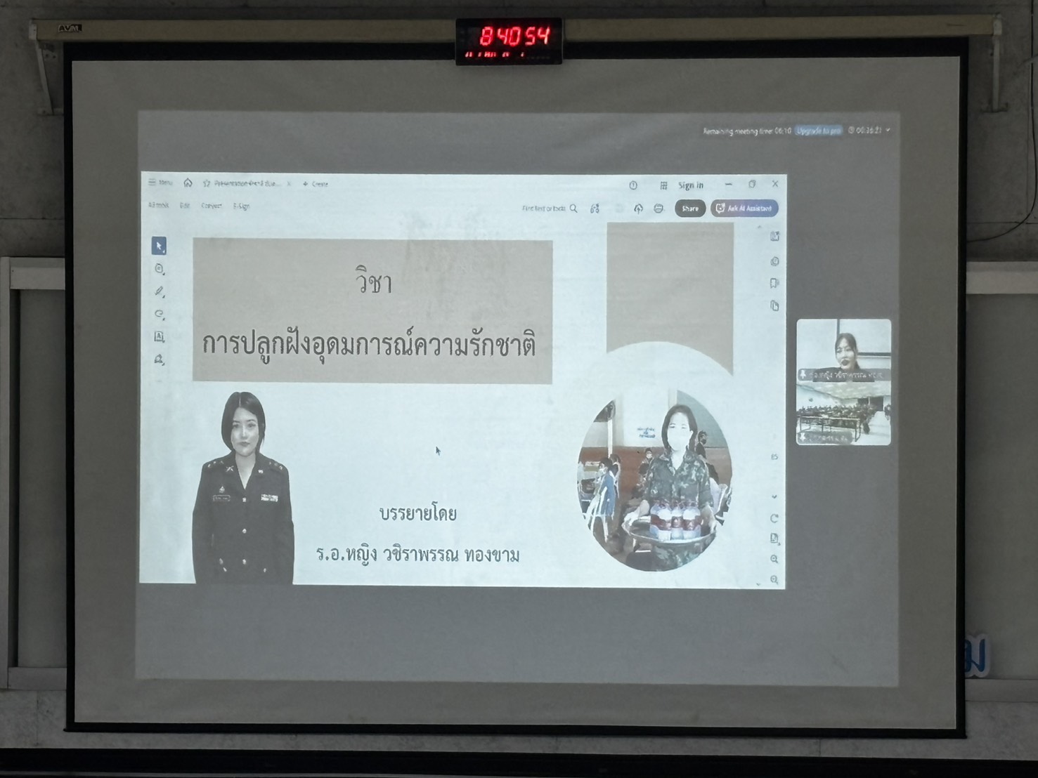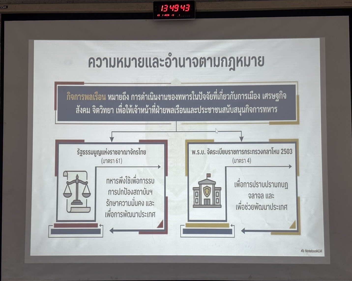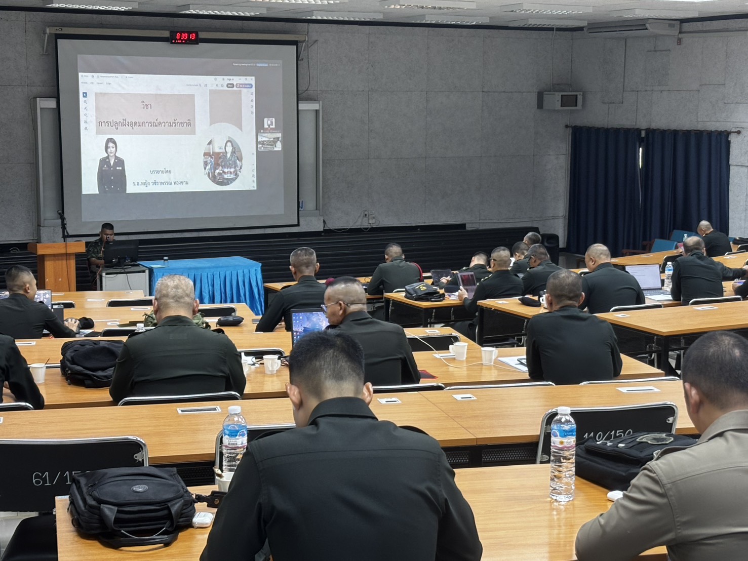 วันจันทร์ที่ 23 มี.ค. 69 เวลา 0800 - 1700 แผนกวิชาฝ่ายอำนวยการ กศ.รร.ม.ศม. โดย ร.อ.หญิง วชิราพรรณ ทองขาม ตำแหน่ง อจ.รร.กร.กร.ทบ. และ ร.ท.คณกร แก้วหอม ตำแหน่ง ผบ.มว.พัน.บร.กบร.ศม. ชรก.แผนกวิชาฝ่ายอำนวยการ กศ.รร.ม.ศม. รับผิดชอบการฝึกอบรม วิชาการปลูกฝังอุดมการณ์ความรักชาติ และ วิชา สธ.5 กิจการพลเรือน หลักสูตรชั้นนายร้อย เหล่า ม. ปี 69 ณ อาคารเรียนรวม 150 ที่นั่ง