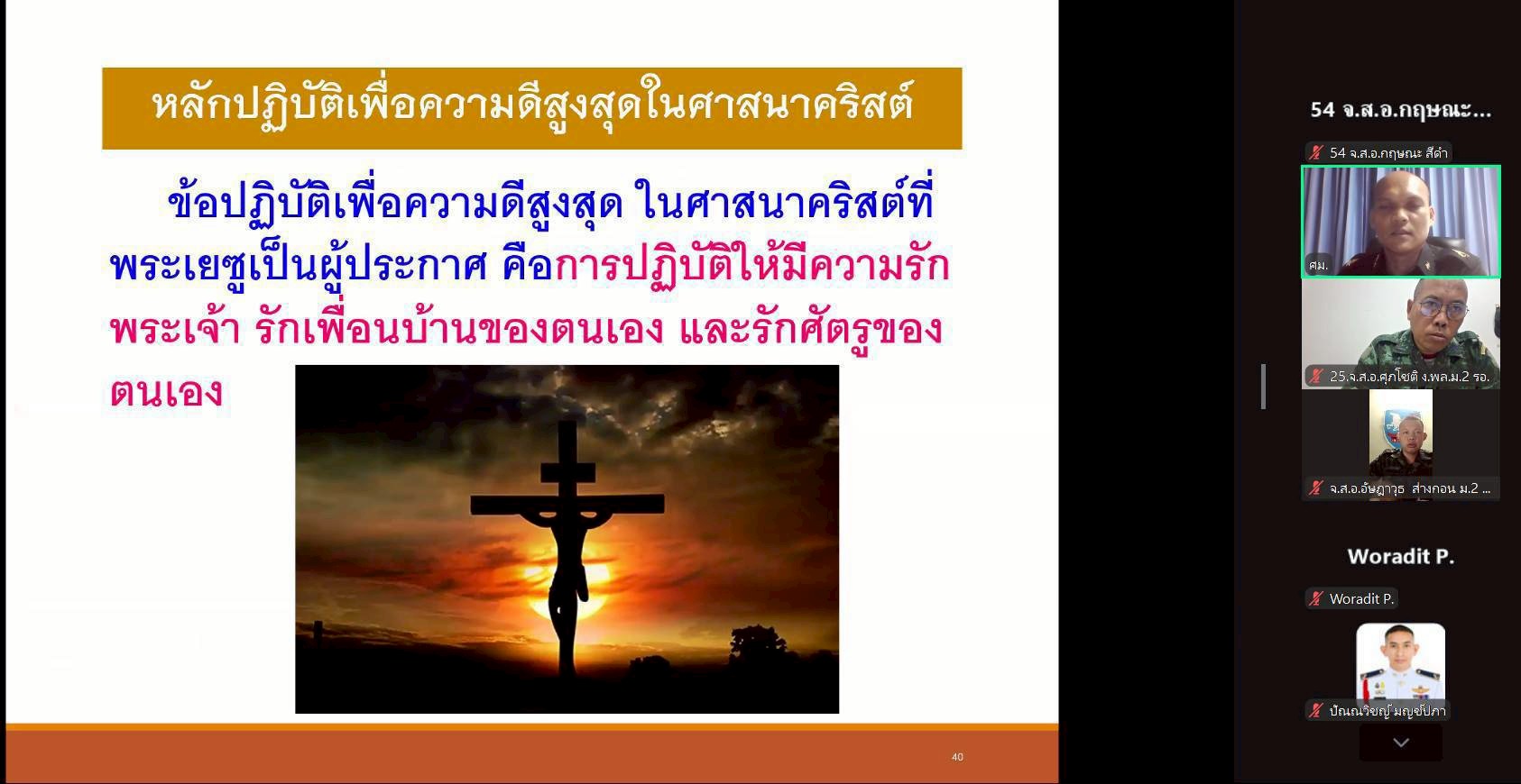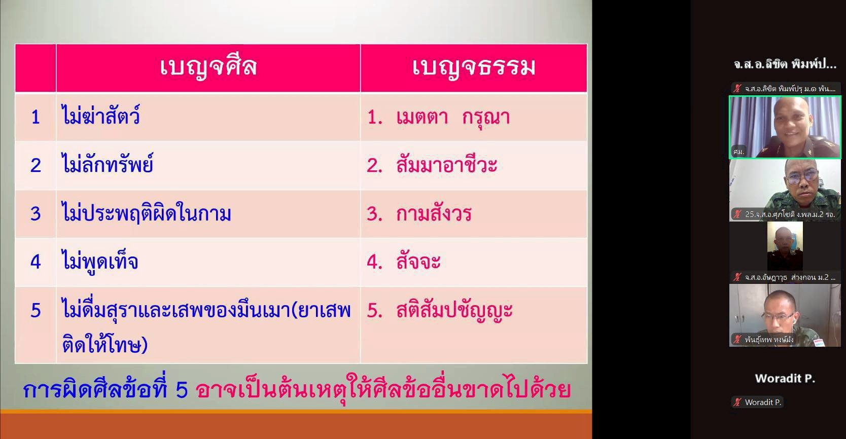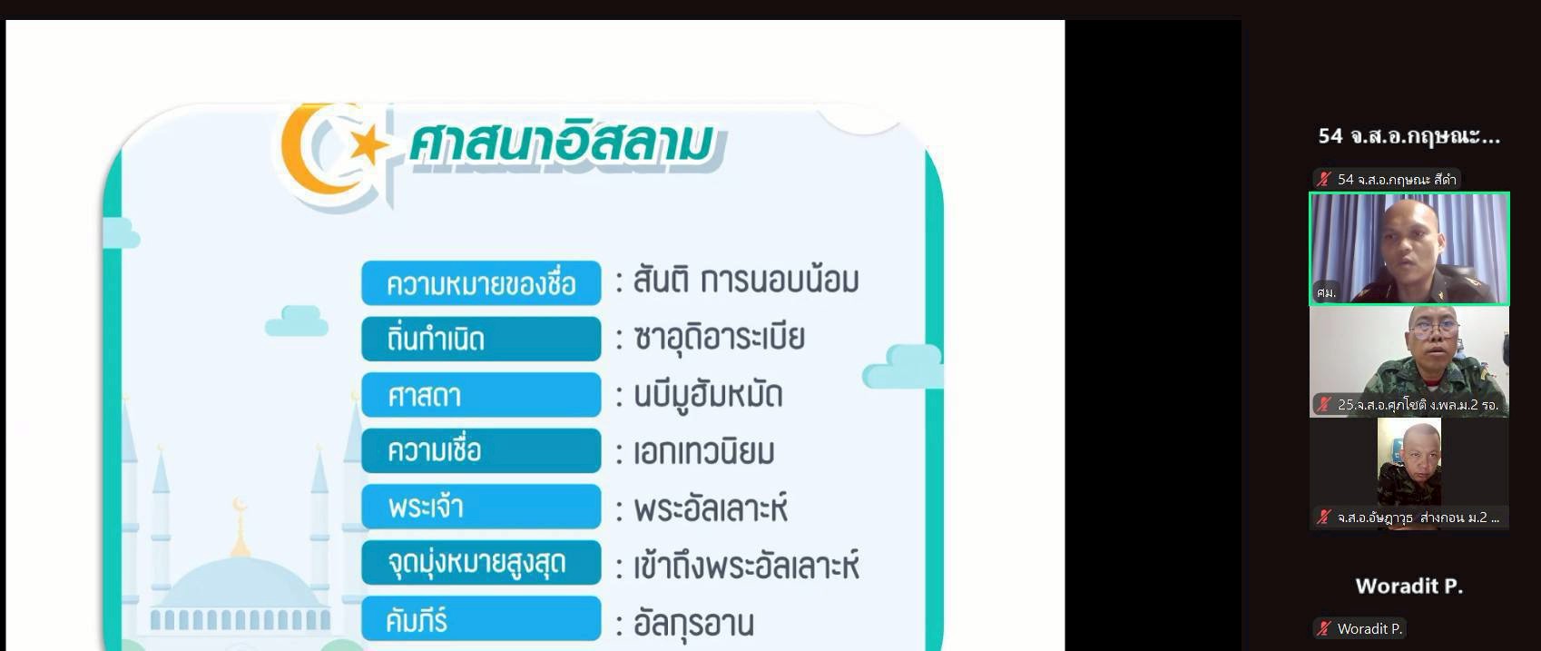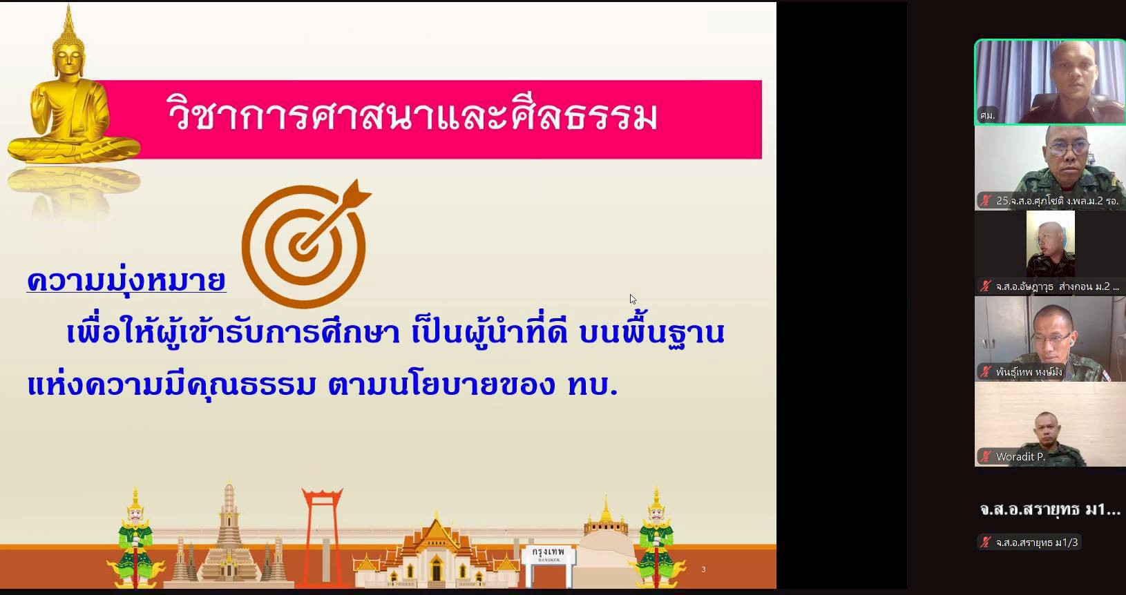 วันจันทร์ที่ 23 ก.พ. 69 เวลา 0900 - 1100 แผนกวิชาทั่วไป กศ.รร.ม.ศม. รับผิดชอบการฝึกอบรม วิชา ศาสนาและศีลธรรม หลักสูตรนายสิบอาวุโส เหล่า ม. รุ่นที่ 2 ปี 69 (Online)