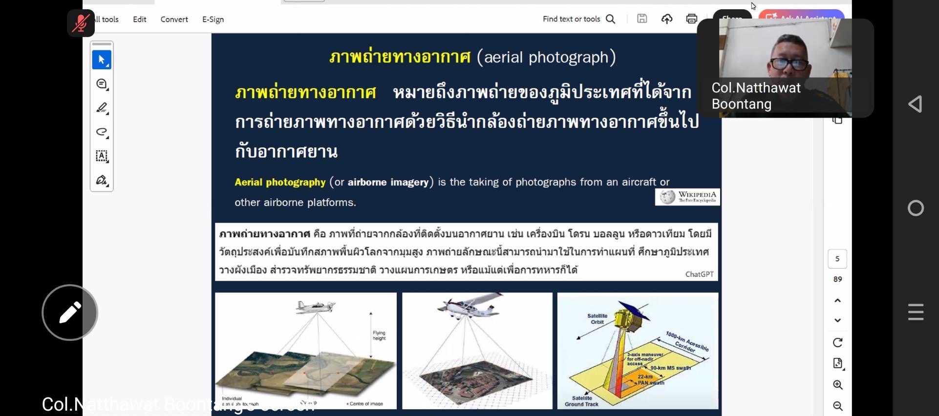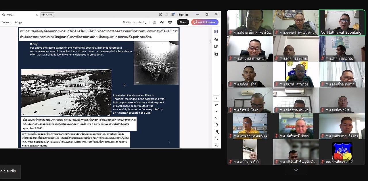 เมื่อวันที่ 23 พ.ค. 68 เวลา 0800-1200 แผนกวิชายุทธวิธี กศ.รร.ม.ศม. ดำเนินการฝึกอบรม วิชาภาพถ่ายทางอากาศ โดย พ.อ. ณัฐวัฒน์  บุญแต่ง อจ.รร.ผท.ทหาร ผ่านระบบ ZOOM Cloud Meeting ให้กับ นทน. หลักสูตรชั้นนายร้อยทั่วไป ฝึกอบรมผ่านสื่ออิเล็กทรอนิกส์