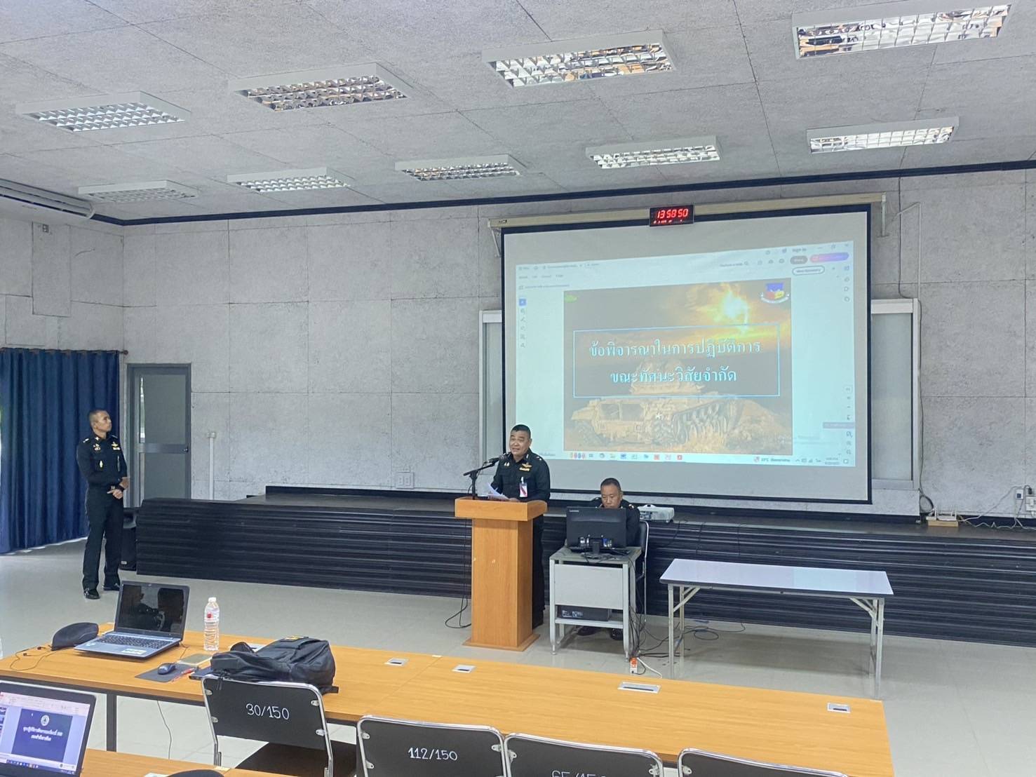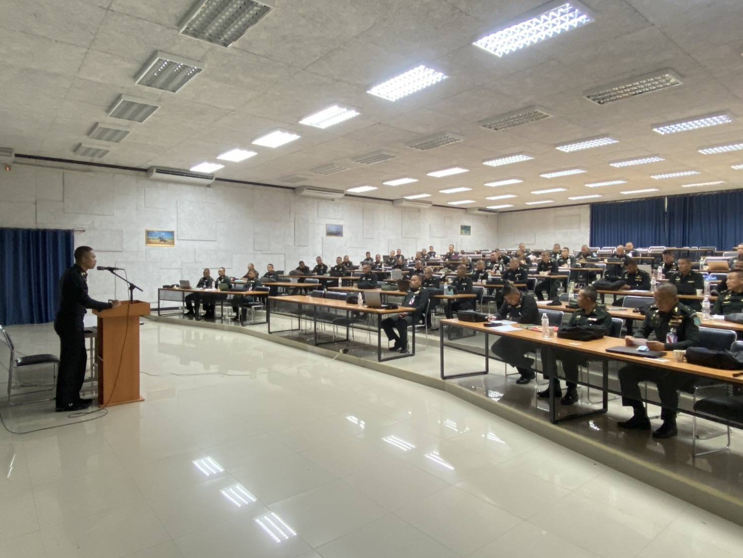 เมื่อวันที่ 25 มิ.ย. 68 เวลา 0800-1700 แผนกวิชายุทธวิธี กศ.รร.ม.ศม. โดย พ.อ.อภิรักษ์ เนียมหลาง  อจ.หน.วิชาการขี่ม้าฯ รรก.อจ.หน.วิชายุทธวิธีฯ และ พ.ท.ยุทธพงษ์ ขวัญม่วง ผบ.พัน.นร. กรม นร.ฯ ชรก.อจ.แผนกวิชายุทธวิธี ดำเนินการฝึกอบรม วิชากองร้อยชุดรบในการรบวิธีรับ และวิธีร่นถอย และ วิชา พัน.ม.ฉก.ในการรบวิธีรุก ให้กับ นทน. หลักสูตรชั้นนายร้อยทั่วไป ฝึกอบรมผ่านสื่ออิเล็กทรอนิกส์ ณ ห้องเรียนรวม 150 ที่นั่ง