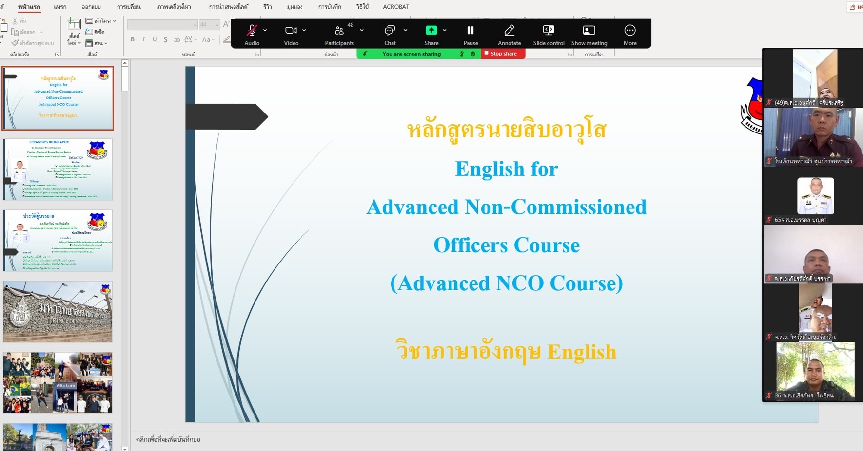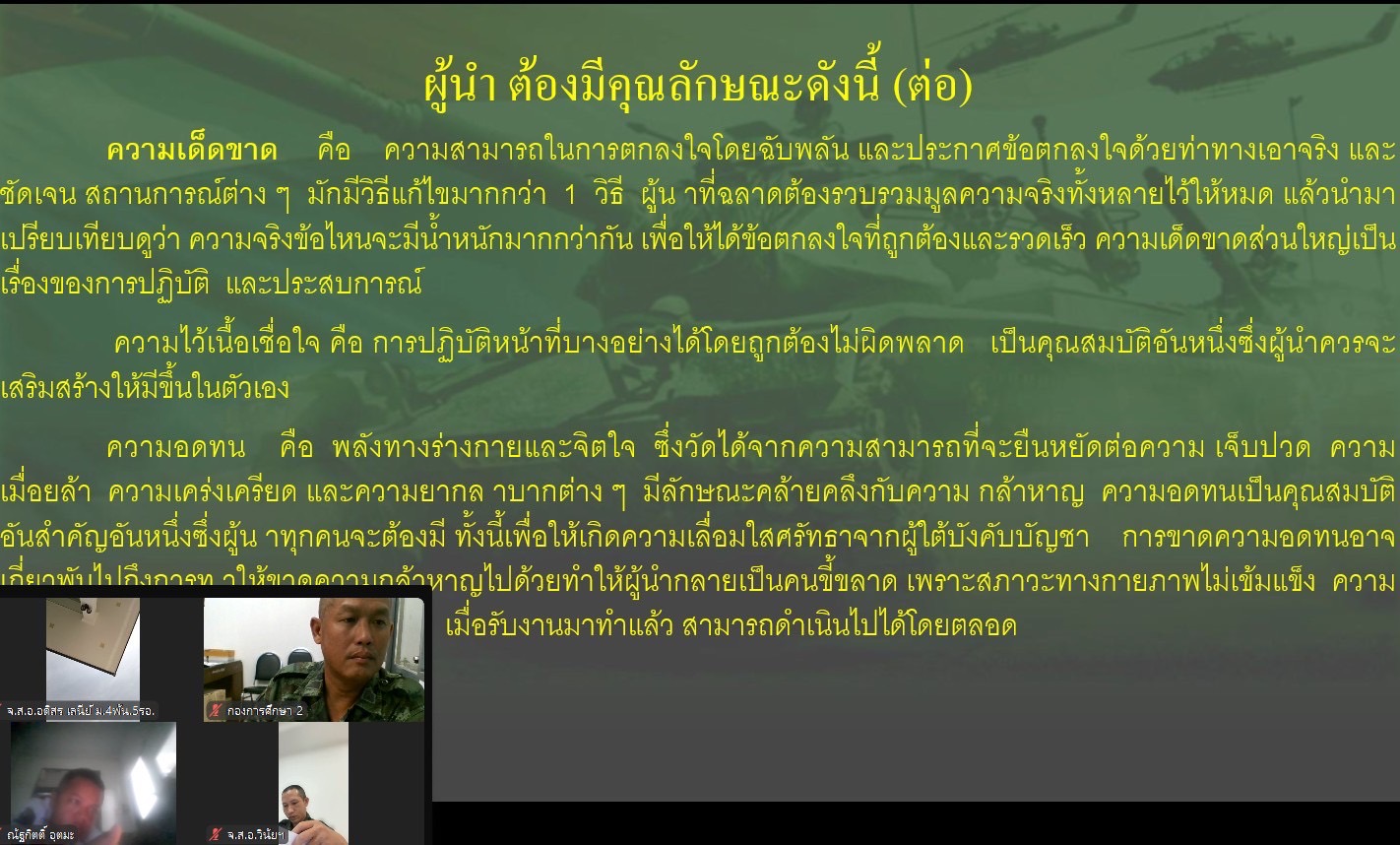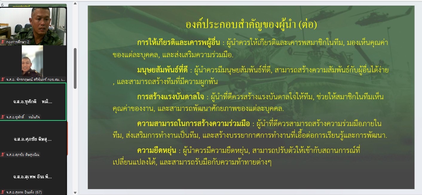 เมื่อวันที่ 5 มิ.ย. 68 แผนกวิชาทั่วไป กศ.รร.ม.ศม. ดำเนินการฝึกอบรม วิชาภาษาอังกฤษ และ วิชาผู้นำหน่วย ผ่านระบบ ZOOM Cloud Meeting ให้กับ นสน. หลักสูตรนายสิบอาวุโส เหล่า ม. รุ่นที่ 3 ปี 68 (ห้วงฝึกอบรมผ่านสื่ออิเล็กทรอนิกส์ ณ ที่ตั้งหน่วย)