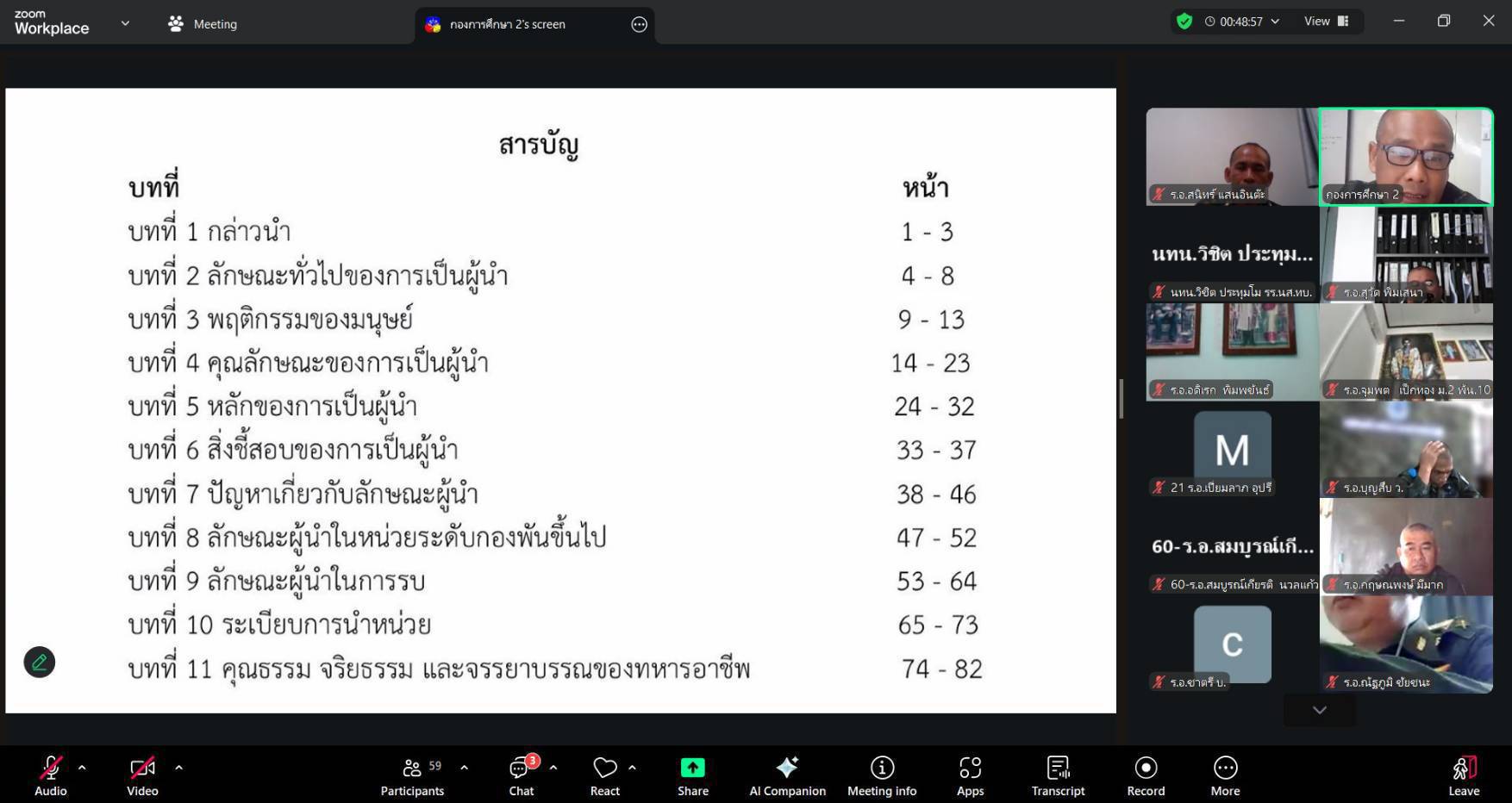 เมื่อวันที่ 14 ต.ค. 68 เวลา 1000-1200 แผนกวิชาทั่วไป กศ.รร.ม.ศม. ดำเนินการฝึกอบรม วิชาผู้นำหน่วย ผ่านระบบ Zoom Cloud Meeting ให้กับ นทน.หลักสูตรชั้นนายพัน เหล่า ม. ปี 69 (ห้วงฝึกอบรมด้วยตนเอง ณ ที่ตั้งหน่วย)