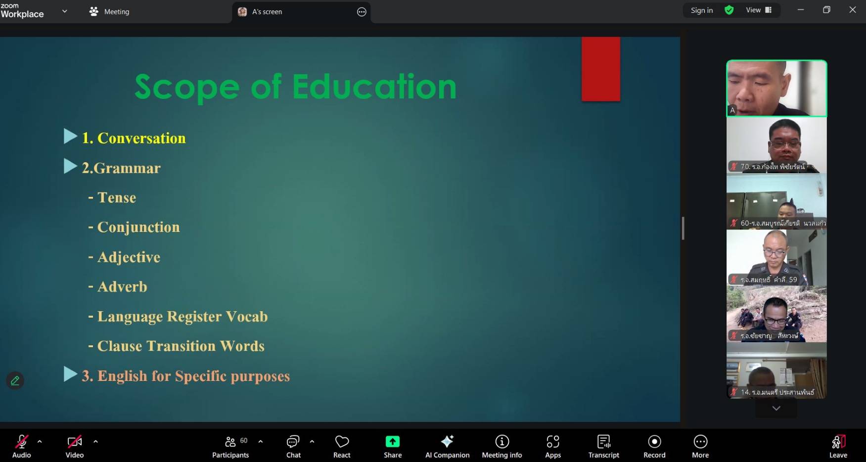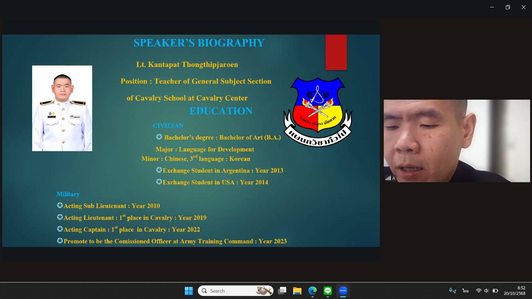 เมื่อวันที่ 20 ต.ค. 68 เวลา 0830-1200 แผนกวิชาทั่วไป กศ.รร.ม.ศม. ดำเนินการฝึกอบรม วิชาภาษาอังกฤษ ให้กับ นทน. หลักสูตรชั้นนายพัน เหล่า ม. ปี 69 ผ่านระบบ Zoom Cloud Meeting (ห้วงฝึกอบรมด้วยตนเอง ณ ที่ตั้งหน่วย)