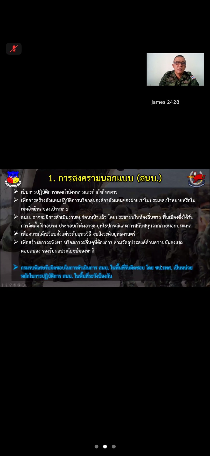 เมื่อวันที่ 9 ธ.ค. 68 เวลา 0800 - 1200 แผนกวิชาการรบพิเศษ กศ.รร.ม.ศม. โดย ร.อ.พันธ์ศักดิ์ ดีศรี, ร.อ. วิศิษฐ์ ทองอินทร์ และ พ.ท.ชานนท์ ลิ้มนุกูล ดำเนินการฝึกอบรม วิชาหลักพื้นฐานการปฏิบัติการพิเศษ, วิชาการป้องกันและปราบปรามการก่อความไม่สงบ และ วิชาการต่อต้านการก่อการร้าย ผ่านระบบ ZOOM Cloud Meeting ให้กับ นสน. หลักสูตรนายสิบอาวุโส เหล่า ม. รุ่นที่ 1 ปี 69 (ห้วงฝึกอบรมผ่านสื่ออิเล็กทรอนิกส์)
