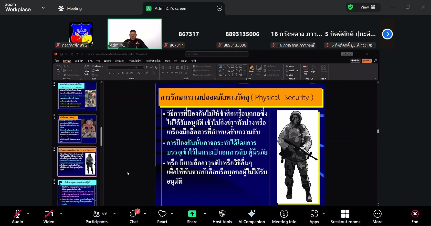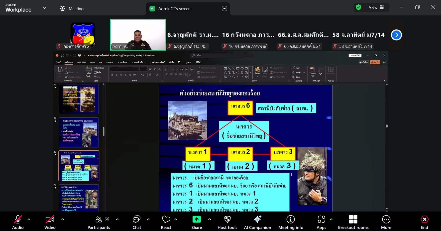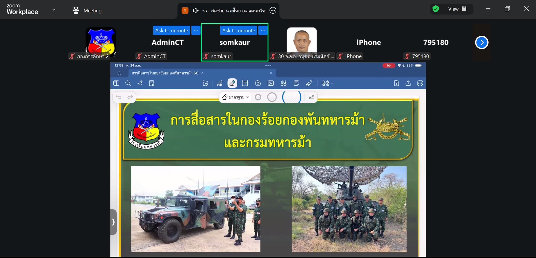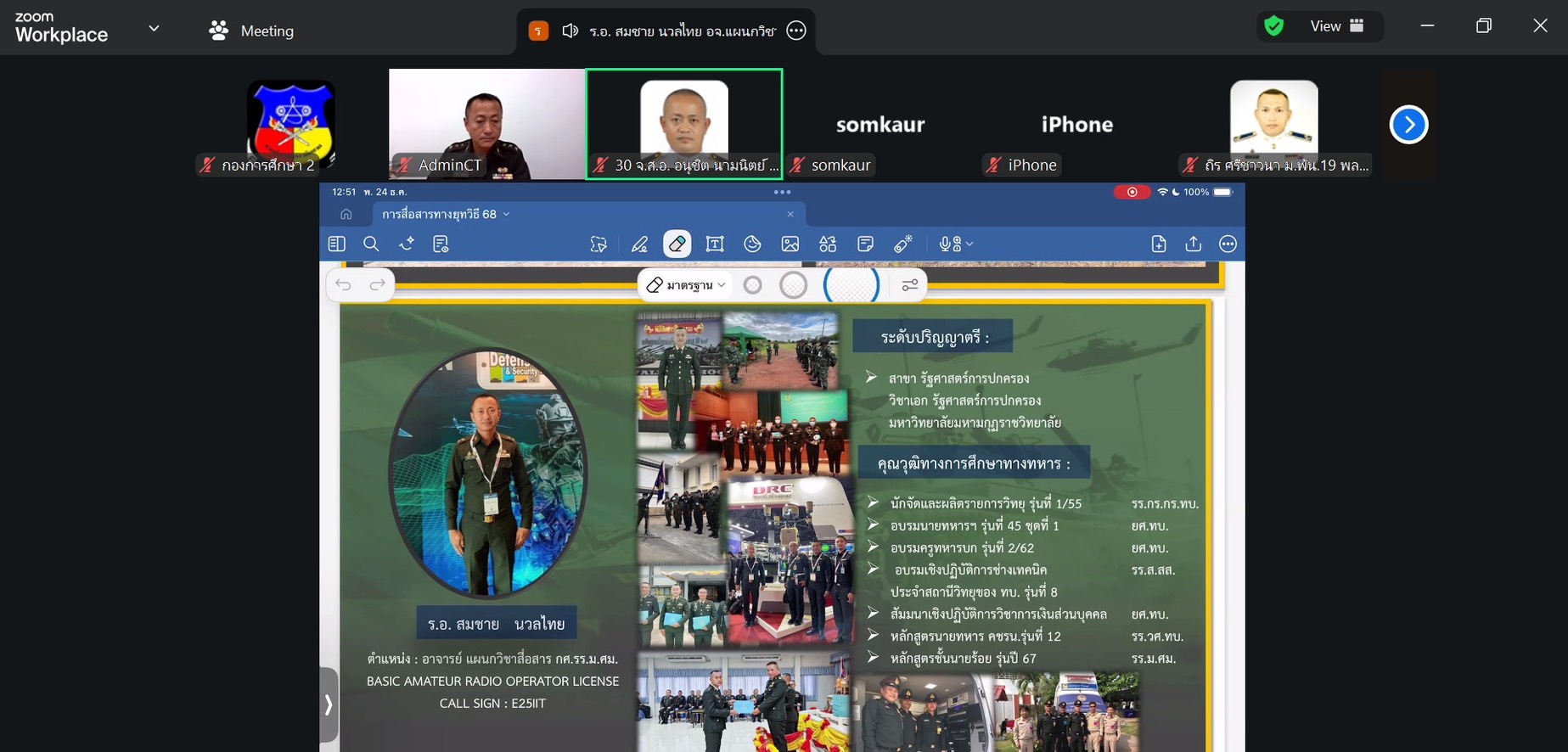 วันที่ 24 ธ.ค. 68 เวลา 0800 - 1500 แผนกวิชาสื่อสาร กศ.รร.ม.ศม. รับผิดชอบการฝึกอบรม หลักสูตรนายสิบอาวุโส เหล่า ม. รุ่นที่ 1 ปี 69 ดำเนินการฝึกอบรม วิชาการรักษาความปลอดภัยทางการสื่อสาร, การสื่อสารในที่บังคับการ, การสื่อสารในกองร้อย และกองพันทหารม้า, การสื่อสารทางยุทธวิธี และ ระเบียบการพูดวิทยุและโทรศัพท์ ผ่านระบบ ZOOM Cloud Meeting อาจารย์ผู้สอน : ร.อ.สมชาย นวลไทย และ จ.ส.อ.รุ่งชัย คุ้มศรี