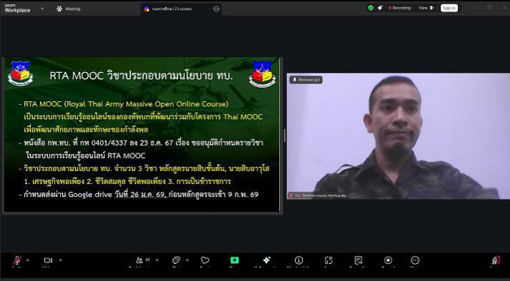 วันที่ 26 ธ.ค. 68 เวลา 0900 - 1600 แผนกวิชาทั่วไป กศ.รร.ม.ศม. รับผิดชอบการฝึกอบรมวิชาครูทหารและการฝึกที่เน้นผลการปฏิบัติ ผ่านระบบ Zoom Cloud Meeting หลักสูตร ส.ชั้นต้น เหล่า ม. รุ่นที่ 1 ปี 69 ห้วงศึกษาผ่านสื่ออิเล็กทรอนิกส์