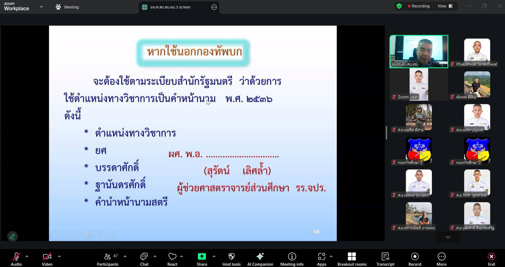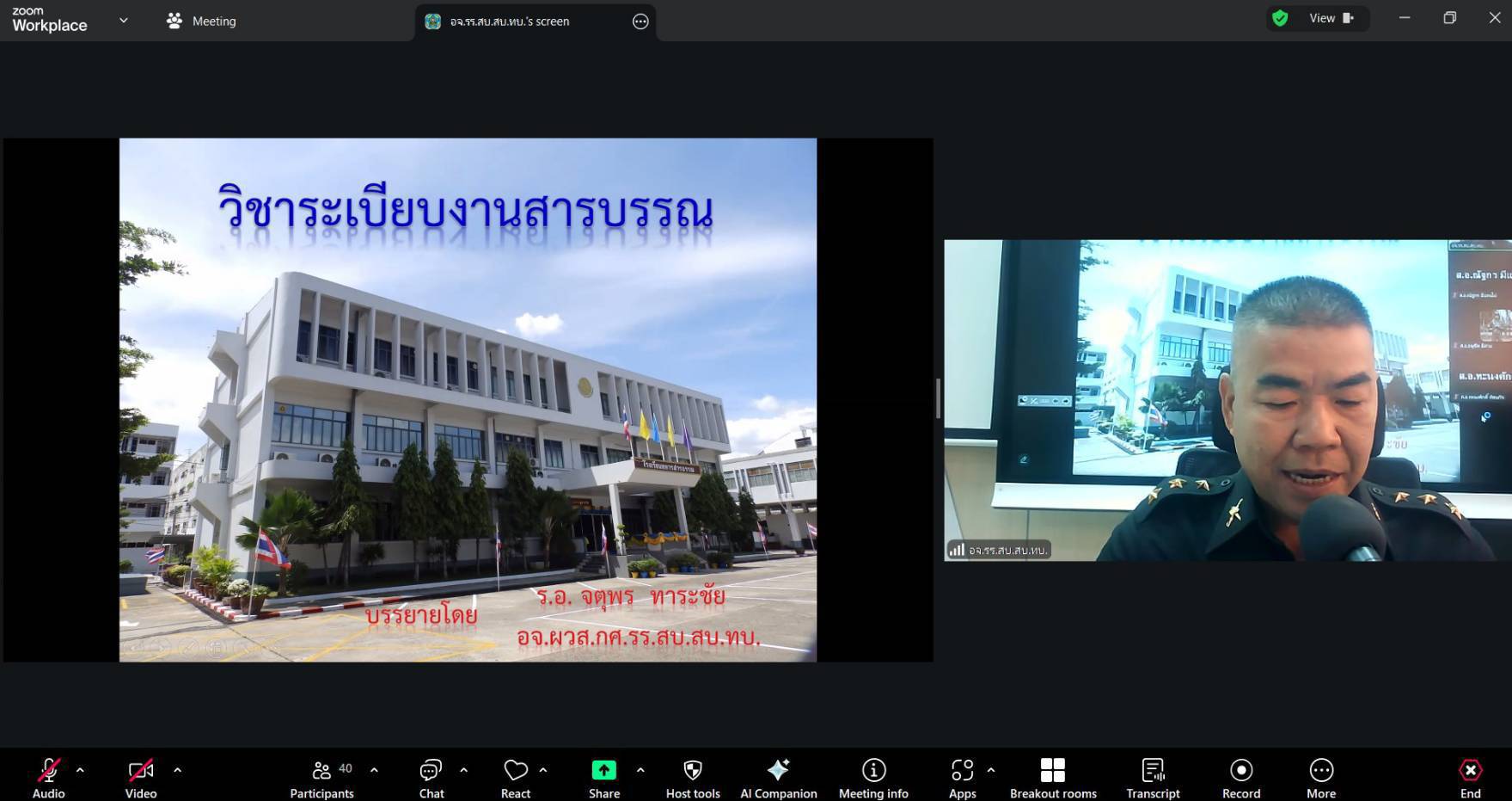 วันที่ 29 ธ.ค. 68 เวลา 0800 - 1200 แผนกวิชาทั่วไป กศ.รร.ม.ศม. รับผิดชอบการฝึกอบรม วิชาระเบียบงานสารบรรณ ผู้สอน ร.อ. จตุพร ทาระชัย อจ.รร.สบ.สบ.ทบ. และ วิชาภาษาอังกฤษ ผู้สอน ร.ต. กันตพัฒน์ ทองทิพย์เจริญ อจ. แผนกวิชาทั่วไป ฯ และ จ.ส.อ. ธนากร แจ่มประไพ ครู แผนกวิชาทั่วไป ฯ ผ่านระบบ ZOOM Cloud Meeting ให้กับ นสน. หลักสูตร ส.ชั้นต้น เหล่า ม. รุ่นที่ 1 ปี 69 ห้วงศึกษาผ่านสื่ออิเล็กทรอนิกส์