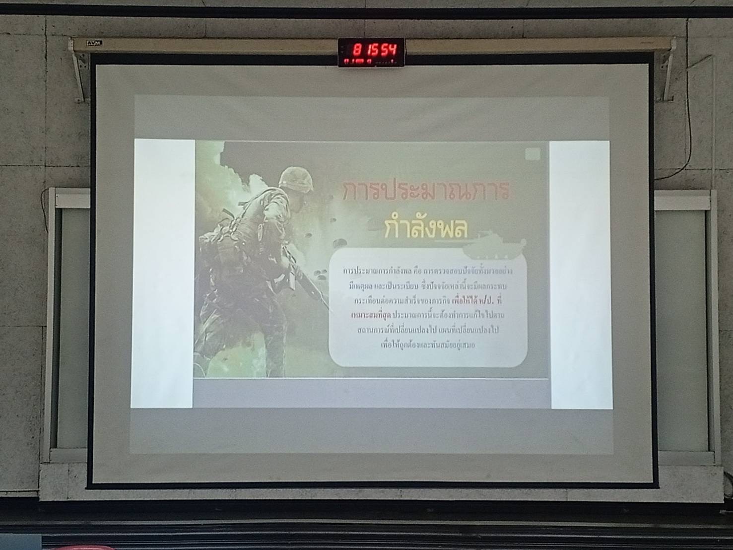 วันศุกร์ ที่ 27 มี.ค. 69 เวลา 0800 - 1700 แผนกวิชาฝ่ายอำนวยการ กศ.รร.ม.ศม. โดย ร.อ.กล้าประจญ สาคำภีร์ ตำแหน่ง ฝอ.1 ม.พัน.27 ชรก.แผนกวิชาฝ่ายอำนวยการ กศ.รร.ม.ศม. รับผิดชอบการฝึกอบรม วิชา สธ.1 การกำลังพลและการแสวงข้อตกลงใจ หลักสูตรชั้นนายร้อย เหล่า ม. ปี 69 ณ อาคารเรียนรวม 150 ที่นั่ง