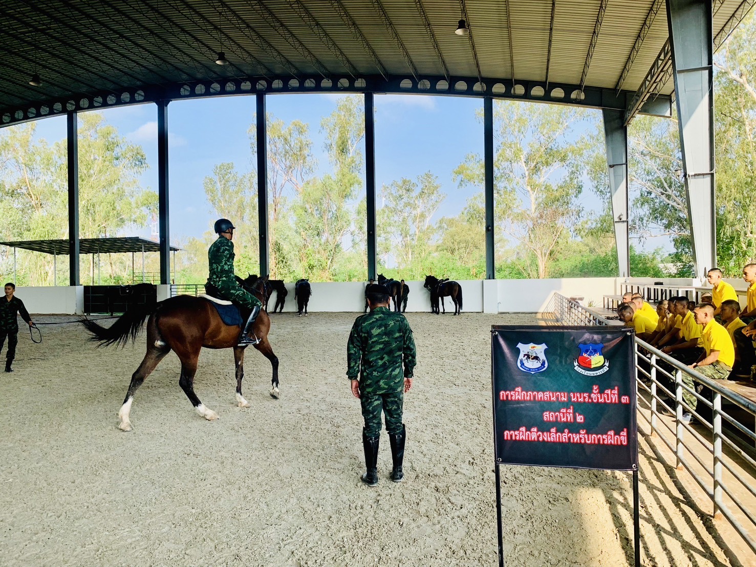 - สถานีที่ 3 การขี่ม้าเบื้องต้น การใช้เครื่องมือบังคับม้า การฝึกขี่ม้าในสนามฝึกฝีเท้าเดินและวิ่งเรียบ